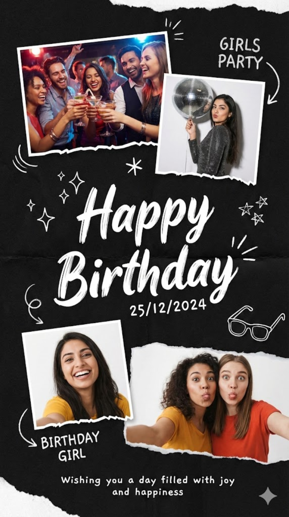 เทมเพลตสตอรี่หรือการ์ดวันเกิดแนวสตรีทอาร์ต สไตล์ภาพตัดแปะ (Scrapbook) บนพื้นหลังสีเข้ม พร้อมกรอบรูปฉีกขาดและลายเส้นวาดมือสุดเก๋