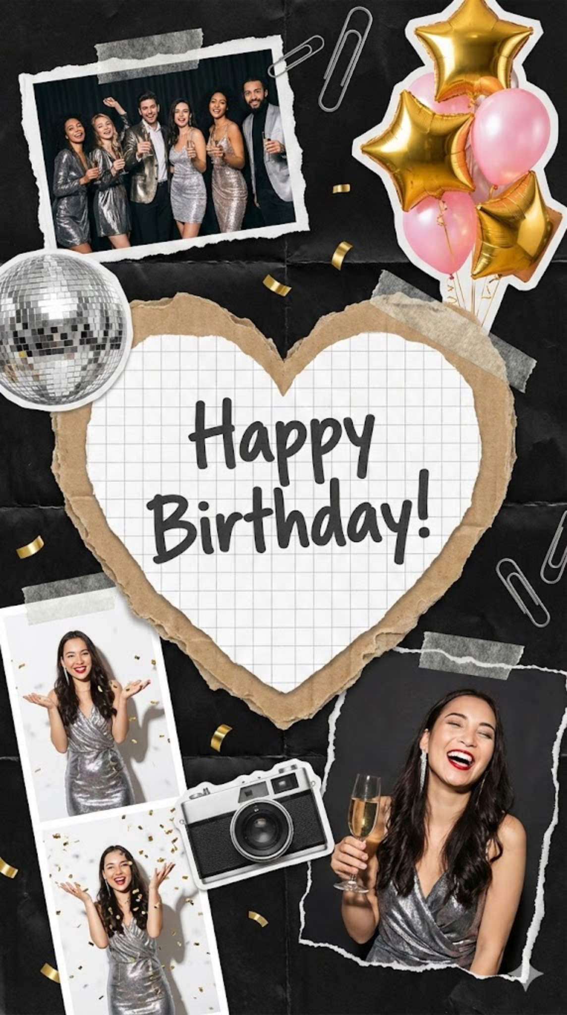 สร้างภาพ IG Story สไตล์ตัดแปะ (Collage) สุดเก๋ ด้วยเท็กซ์เจอร์กระดาษยับ กรอบรูปฉีกขาด และของตกแต่งปาร์ตี้ เหมาะสำหรับอวยพรวันเกิด