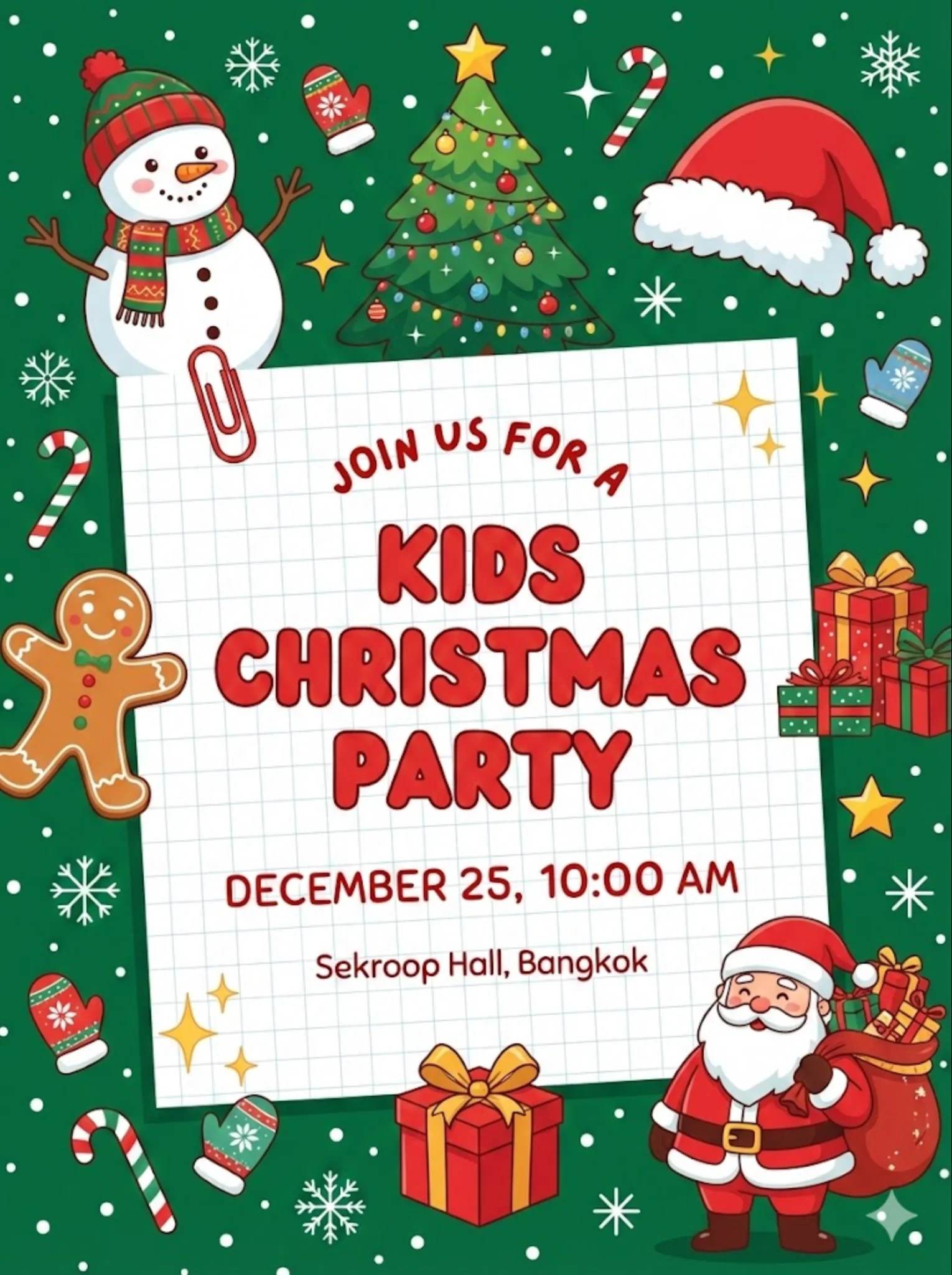แม่แบบโปสเตอร์เชิญร่วมงานปาร์ตี้ธีมคริสต์มาส ตกแต่งด้วยตัวการ์ตูนน่ารักและกระดาษโน้ตกลางภาพ