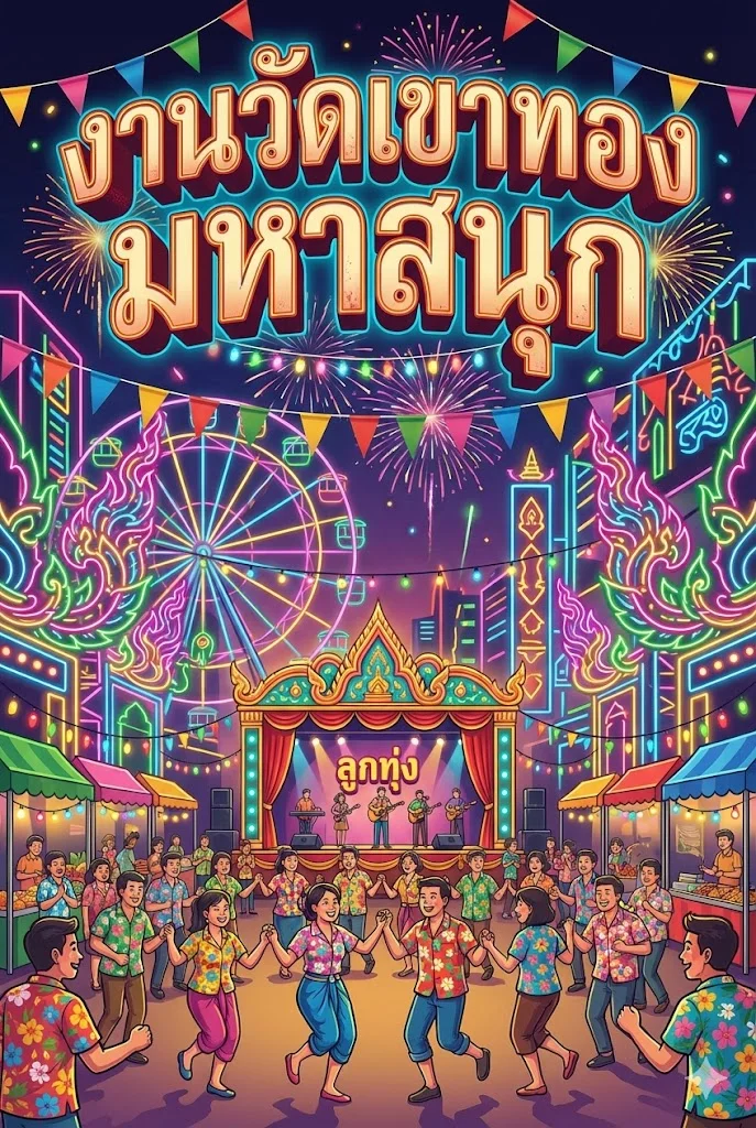 แม่แบบโปสเตอร์สไตล์งานวัด งานลอยกระทง หรือสงกรานต์ ที่มีความสนุกสนาน สีสันฉูดฉาดแบบไทยๆ คำแนะนำ: ใช้โปรโมทงานรื่นเริง งานบุญ หรือคอนเสิร์ตลูกทุ่ง