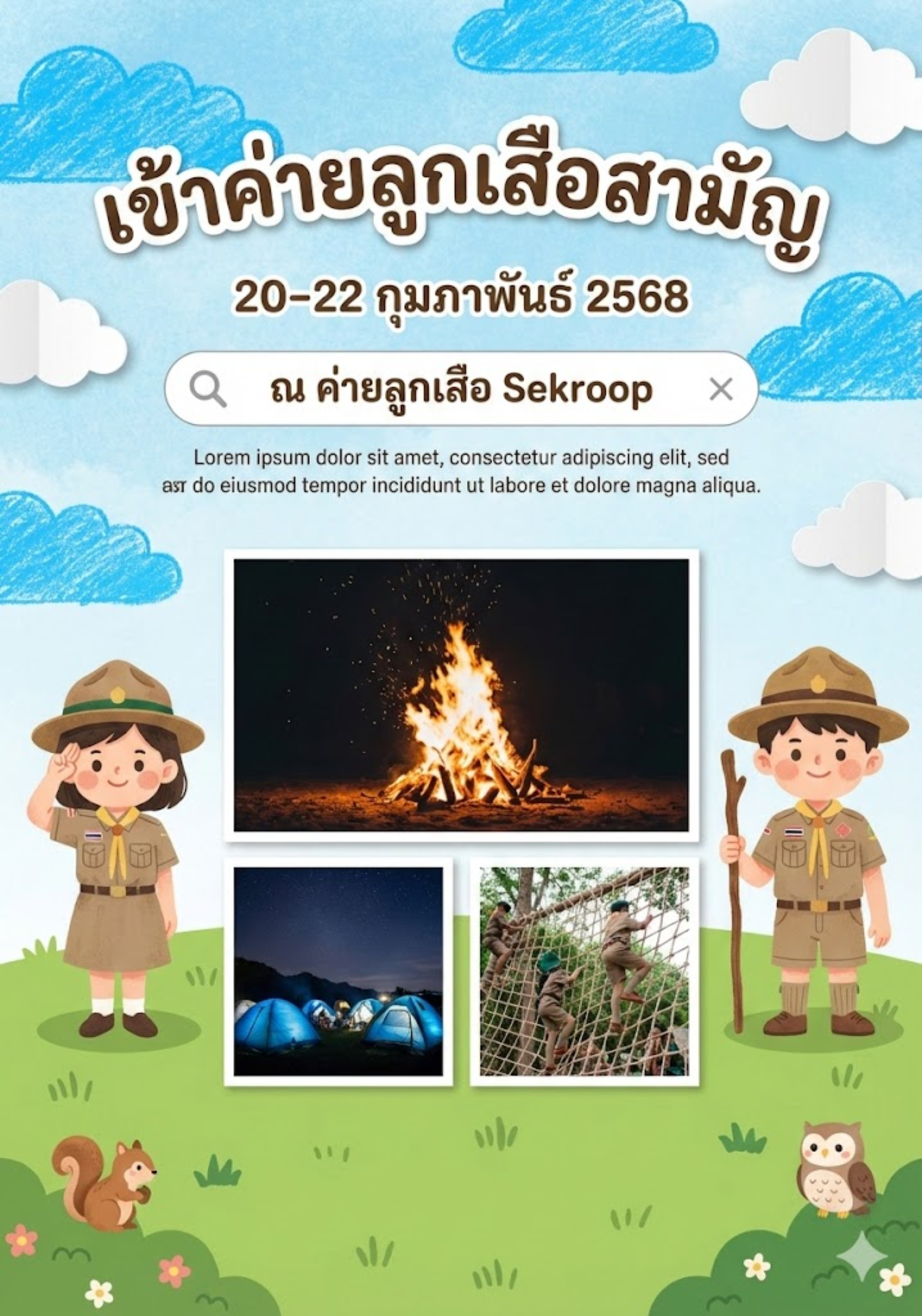 เทมเพลตโปสเตอร์กิจกรรมโรงเรียนหรือทัศนศึกษา สไตล์ภาพวาดน่ารักสดใส พร้อมช่องใส่รูปภาพประกอบกิจกรรม