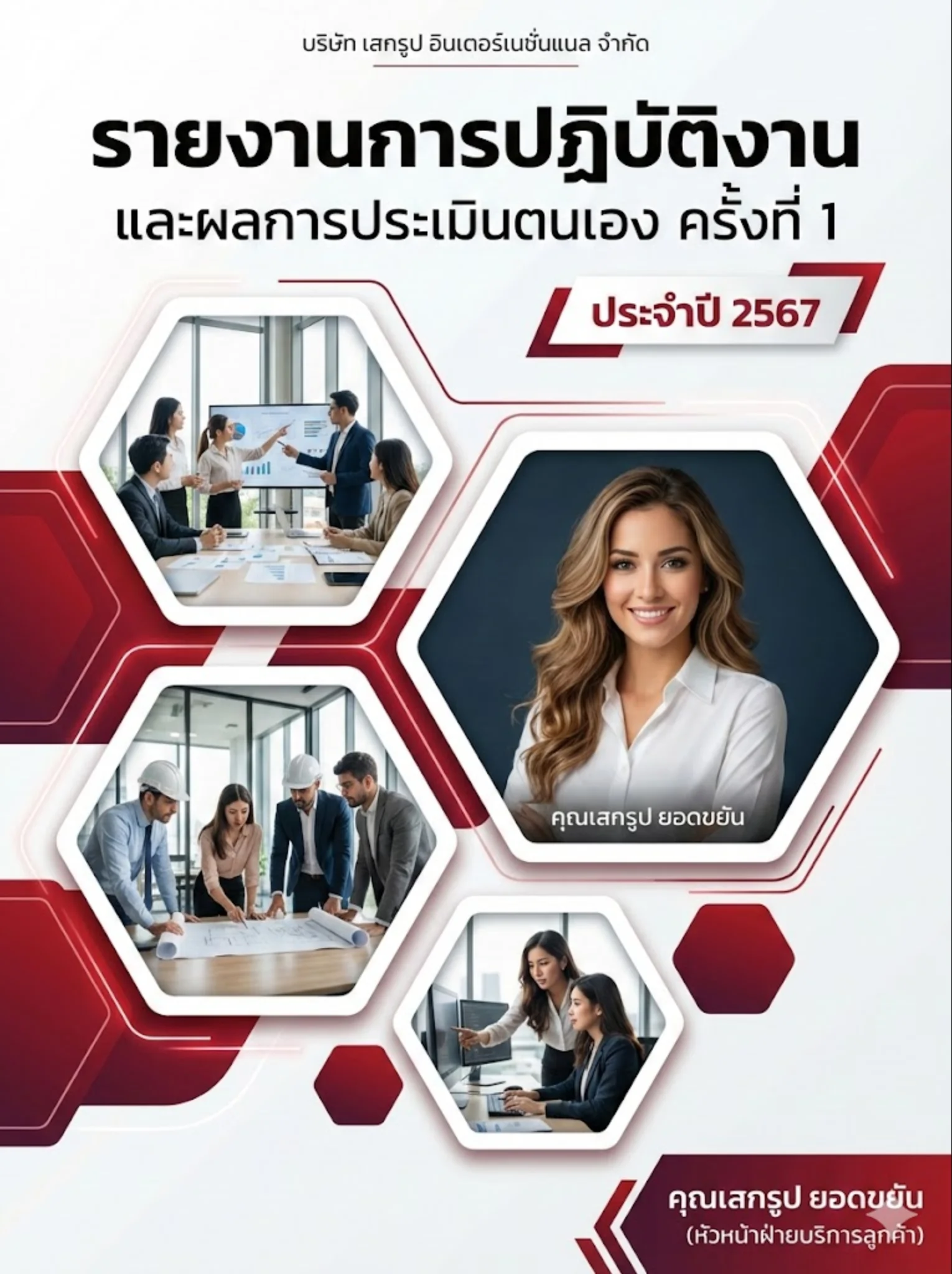 แบบฟอร์มหน้าปกรายงานการปฏิบัติงานหรือประเมินผลงานประจำปี ดีไซน์องค์กรทันสมัยด้วยกรอบรูปหกเหลี่ยม ดูเป็นมืออาชีพ