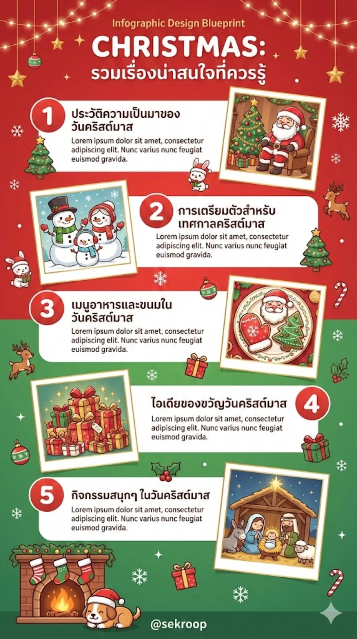 เทมเพลตอินโฟกราฟิกสำหรับนำเสนอข้อมูลหรือเรื่องราวน่าสนใจเกี่ยวกับเทศกาลคริสต์มาส แบ่งเป็น 5 หัวข้อย่อย พร้อมภาพประกอบสไตล์การ์ตูนน่ารัก