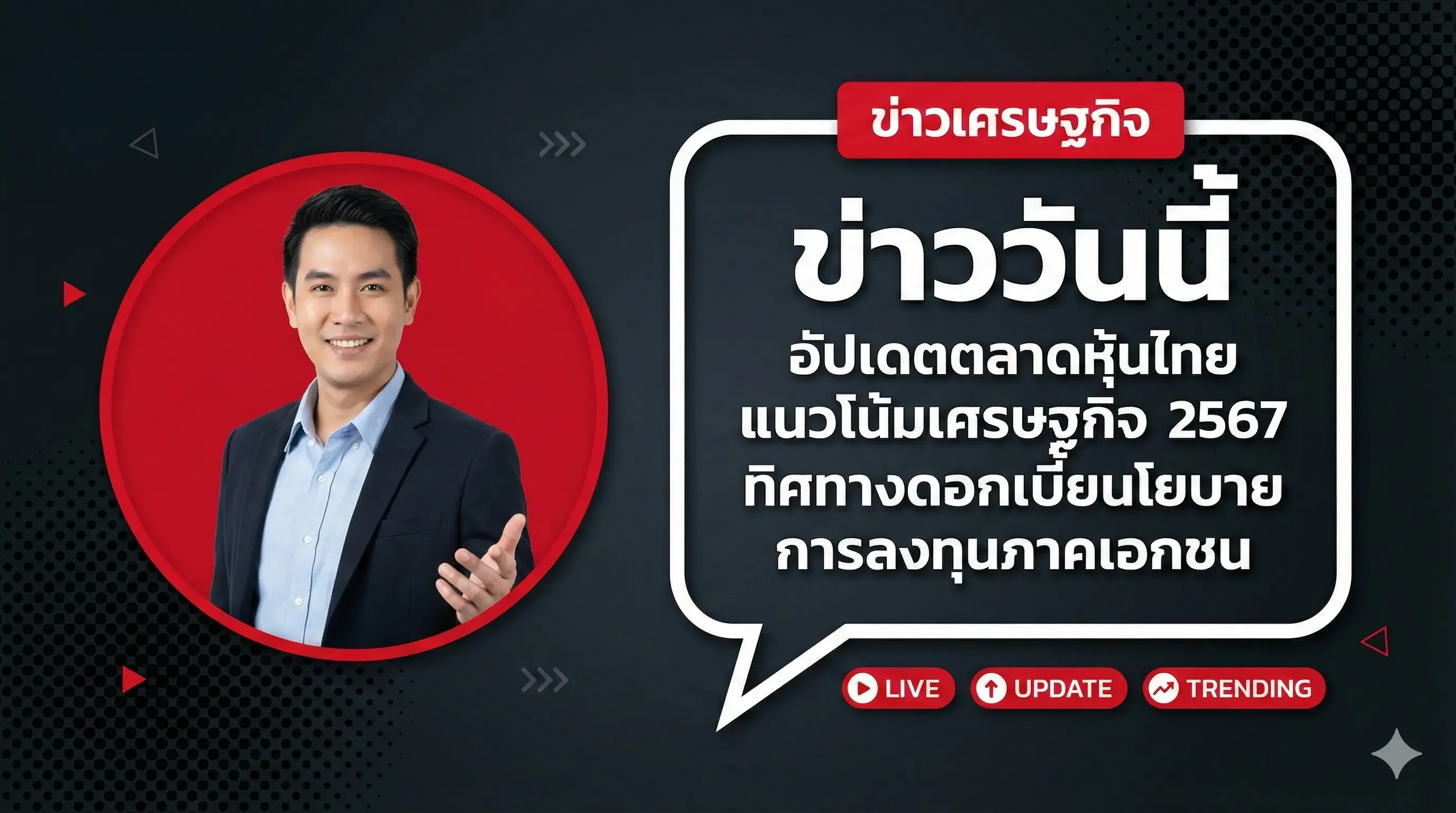 แม่แบบกราฟิกสไตล์รายการข่าว (News Broadcast) เหมาะสำหรับการสรุปข่าวประจำวัน, การวิเคราะห์เศรษฐกิจ, หรือการประกาศสำคัญที่ต้องการความน่าเชื่อถือสูง เน้นความคมชัดและอ่านง่าย Template นี้เหมาะมากสำหรับการทำปกคลิป Youtube หรือภาพประกอบข่าวบน Social Media ให้เปลี่ยนข้อความ ให้ตรงกับเนื้อหาของคุณ โดยเฉพาะส่วน Main Visual สามารถเปลี่ยนจากคนเป็นกราฟิกกราฟหุ้นหรือวัตถุอื่นๆ ได้ตามต้องการ