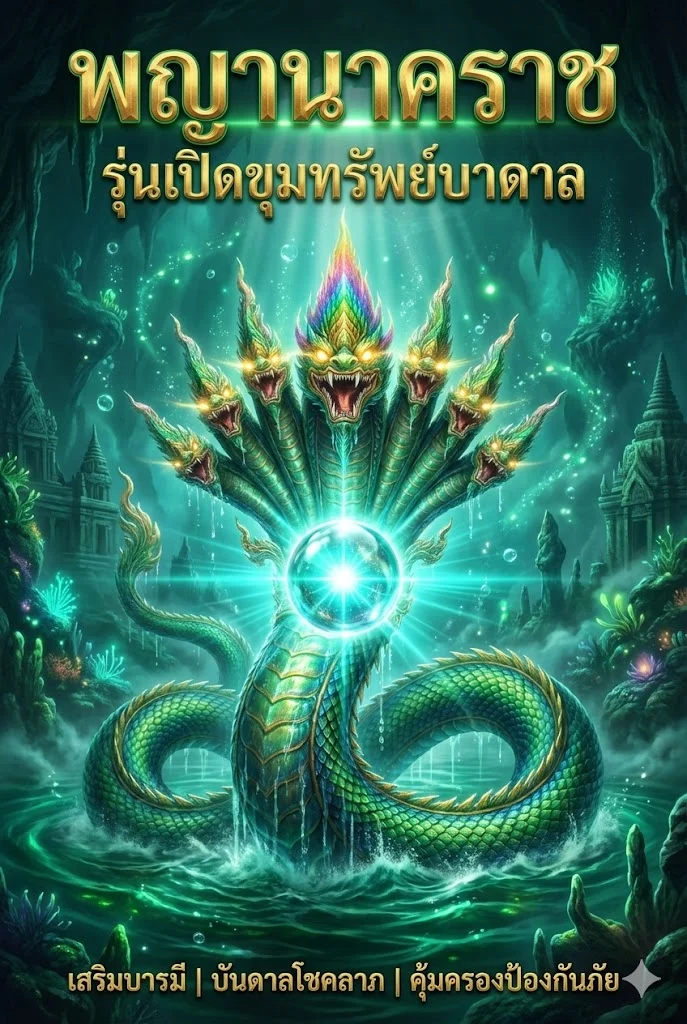 แม่แบบโปสเตอร์สำหรับโปรโมตวัตถุมงคลหรือเชิญชวนร่วมพิธีบวงสรวงพญานาคราช เน้นความยิ่งใหญ่ ศักดิ์สิทธิ์ และพลังลึกลับแห่งเมืองบาดาล คำแนะนำการใช้งาน: ระบุชื่อรุ่นวัตถุมงคลหรือชื่องานพิธี