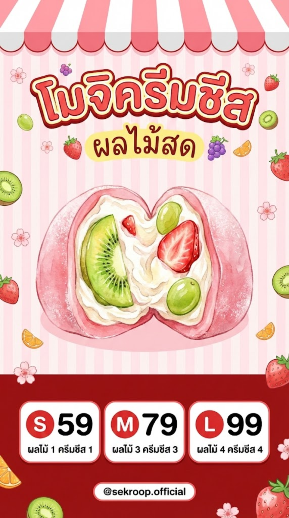 เทมเพลตสำหรับสร้างโปสเตอร์เมนูโมจิครีมสด หรือไดฟุกุผลไม้ สไตล์น่ารักสดใส เหมาะสำหรับร้านขนมหวาน คาเฟ่ หรือโปรโมทสินค้าออนไลน์