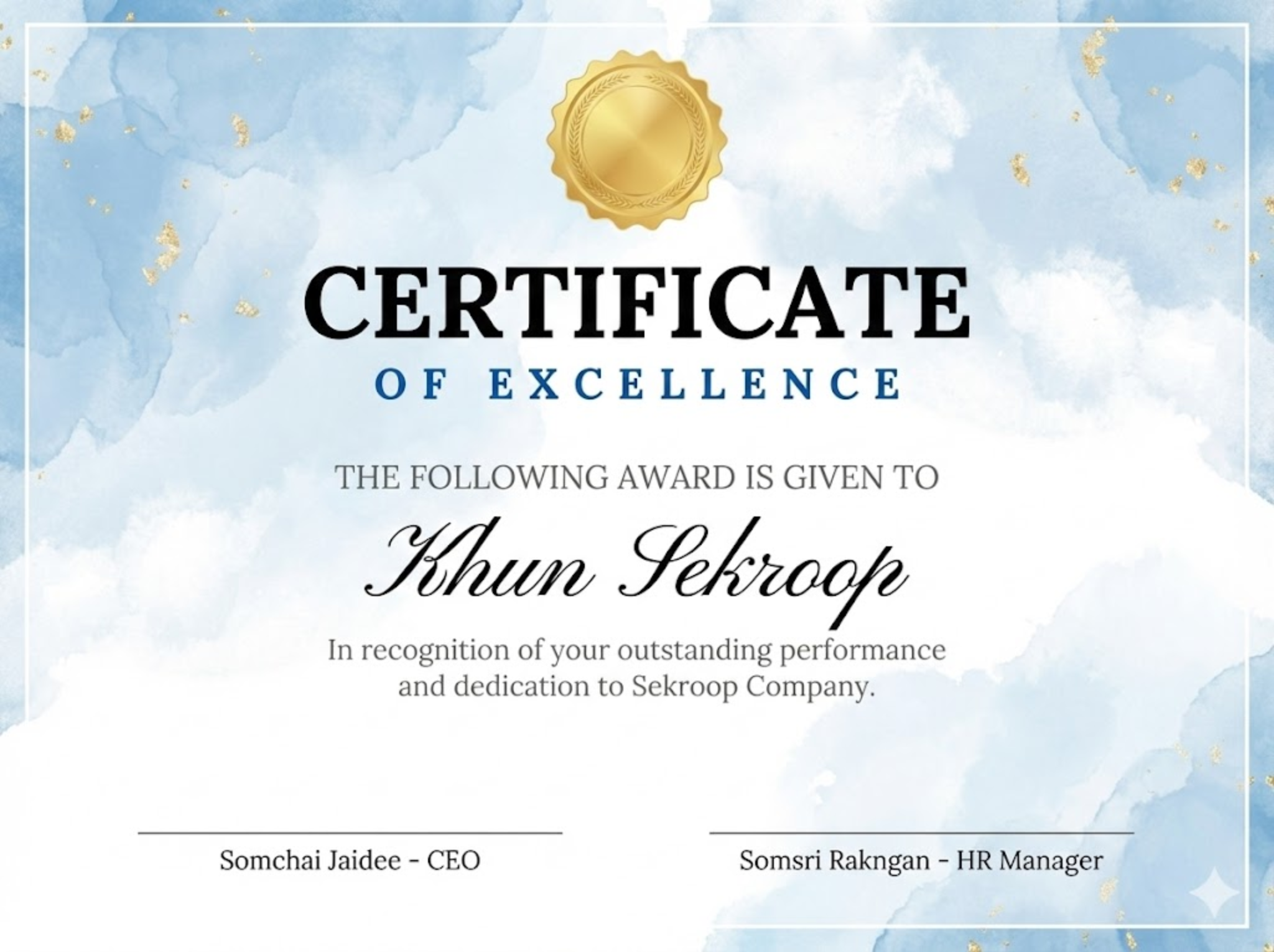 เทมเพลตใบประกาศเกียรติคุณสไตล์สีน้ำสีฟ้า-ทอง ดูหรูหราและเป็นทางการ เหมาะสำหรับมอบรางวัลนักเรียนหรือพนักงาน