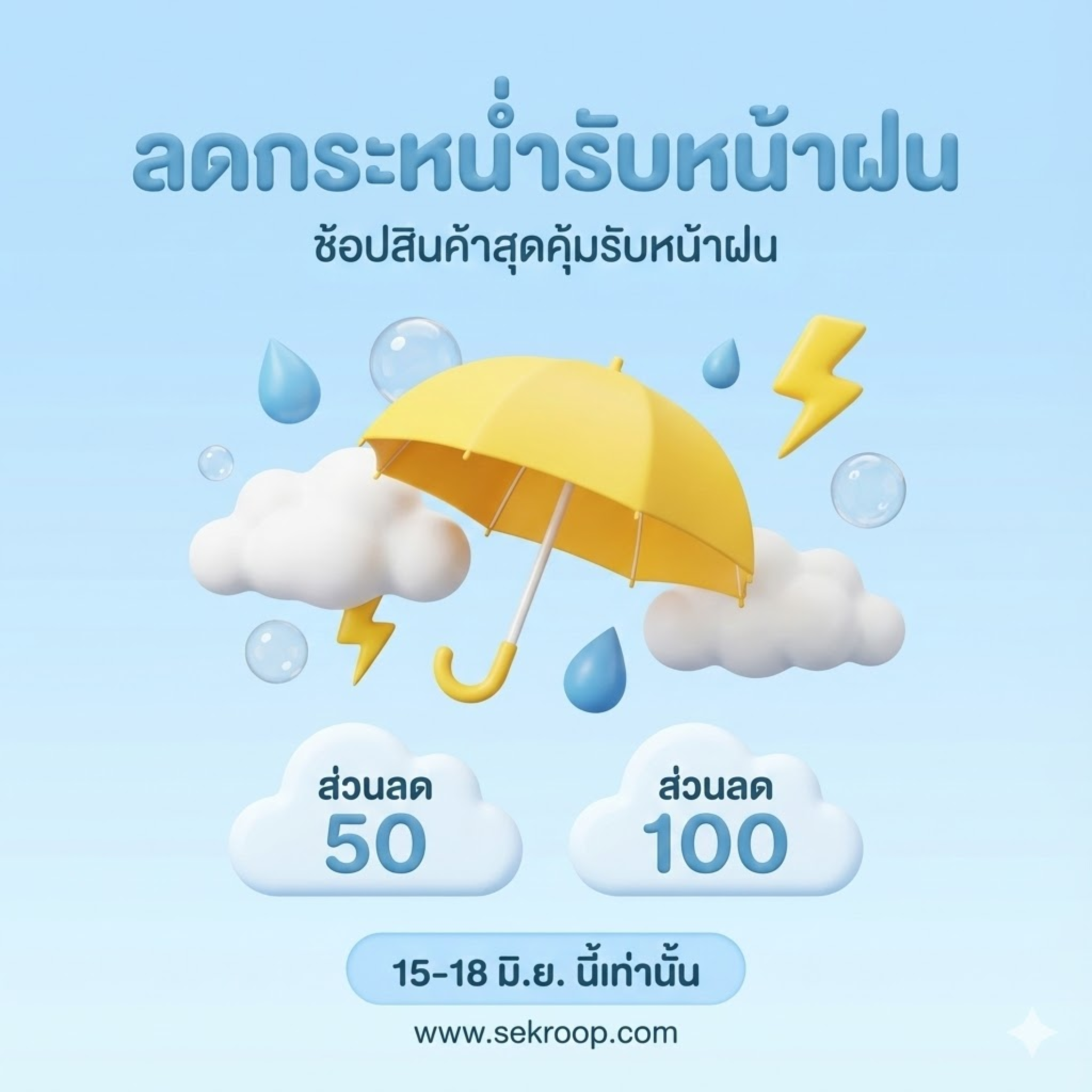 เทมเพลตภาพโฆษณาสไตล์ 3D Render น่ารัก สดใส ตกแต่งด้วยก้อนเมฆและองค์ประกอบหน้าฝน เหมาะสำหรับแจ้งโปรโมชั่น
