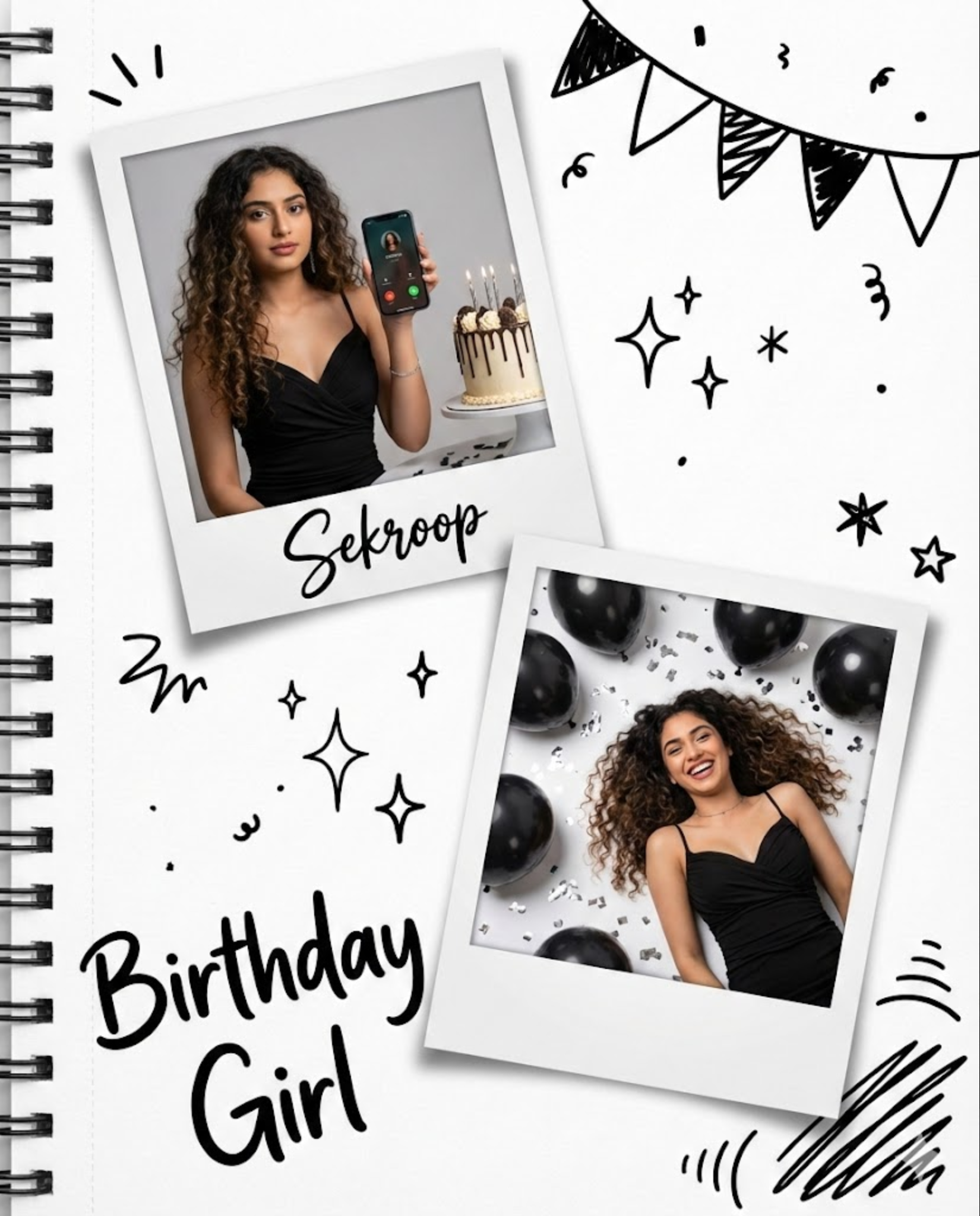 เทมเพลตวันเกิดสไตล์สมุดภาพทำมือ (Scrapbook) ตกแต่งด้วยรูปถ่ายโพลาลอยด์และลายเส้นวาดเล่น น่ารักและเป็นกันเอง เหมาะสำหรับลงโซเชียล