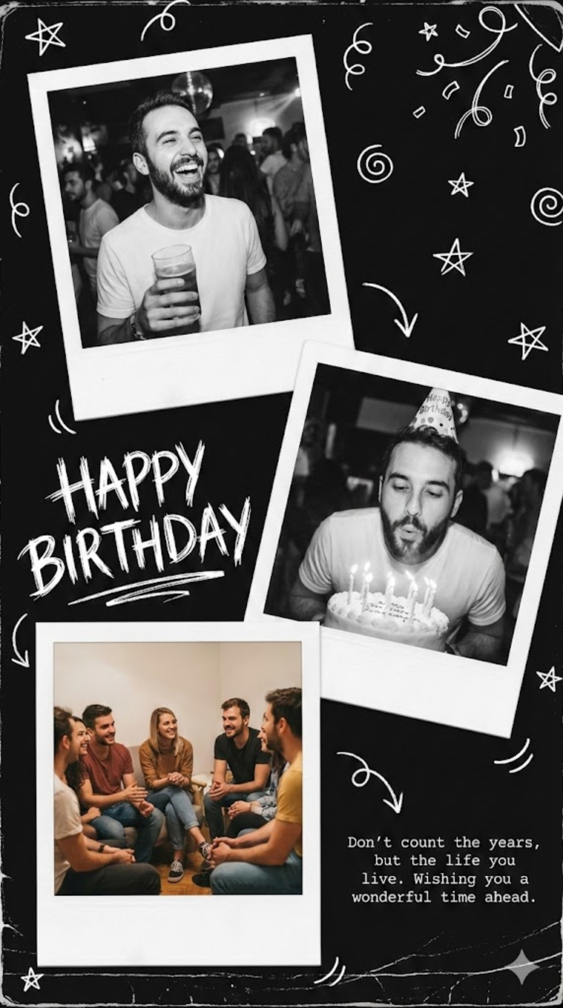 #birthday#collage#polaroid#story#instagram#black and white#retro#scrapbook
