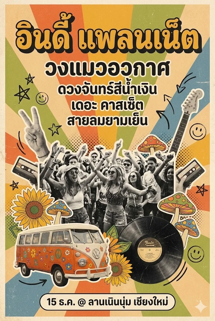 แม่แบบโปสเตอร์สำหรับเทศกาลดนตรีหรืองานอาร์ต ที่ใช้สไตล์คอลลาจ (Collage) ยุค 70s ผสมผสานภาพถ่าย, กราฟิก, และเท็กซ์เจอร์ สร้างอารมณ์อิสระ, ความคิดสร้างสรรค์, และความสนุกสนาน เหมาะกับงานที่เน้นกลุ่มเป้าหมายวัยรุ่นและคนรุ่นใหม่ คำแนะนำการใช้งาน: เตรียมรายชื่อศิลปินและภาพประกอบที่เกี่ยวกับธีมงาน