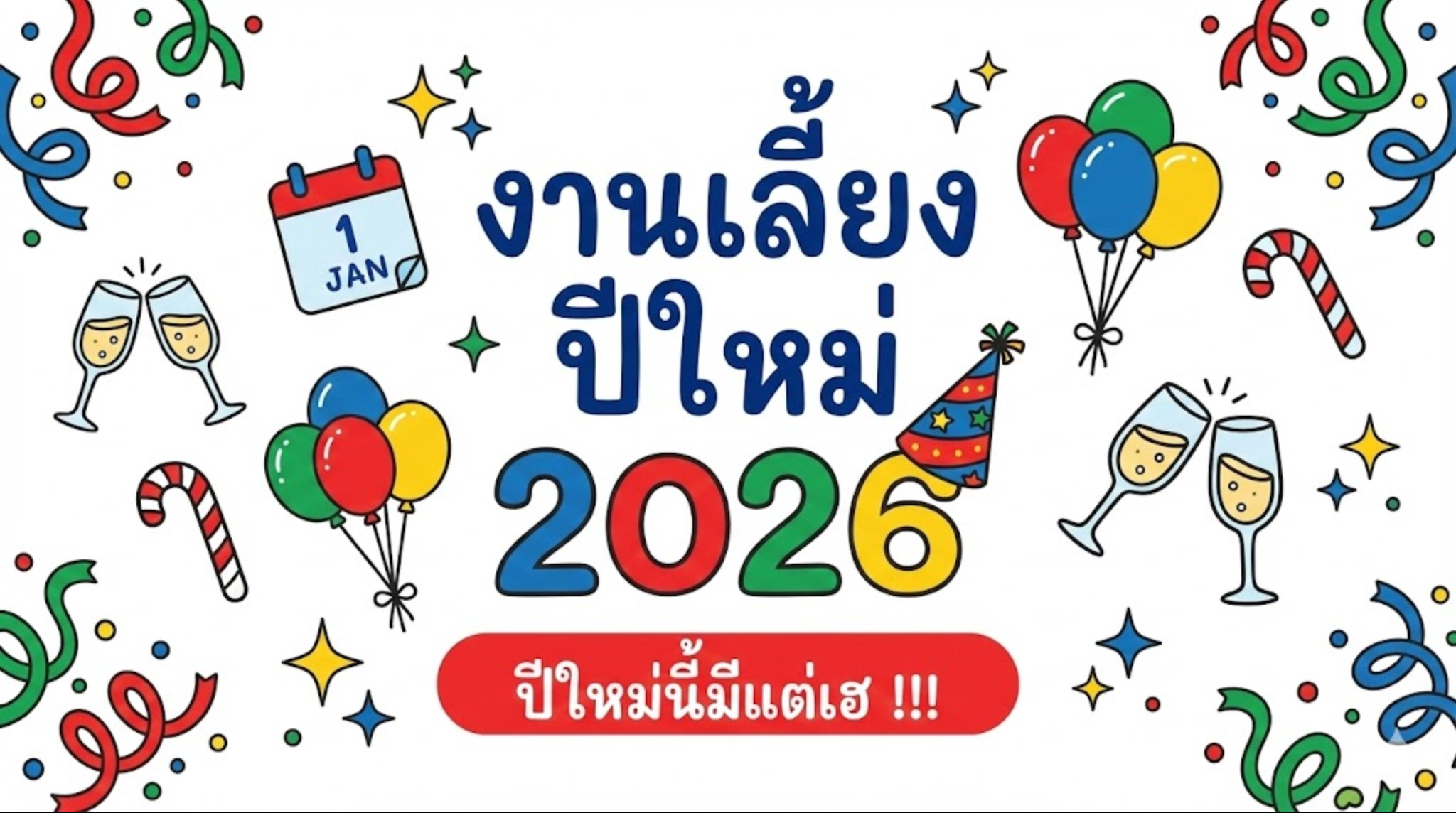 เทมเพลตสำหรับสร้างการ์ดเชิญหรืองานปาร์ตี้ปีใหม่ สไตล์ภาพวาดลายเส้นน่ารัก (Doodle) สีสันสดใส บนพื้นหลังขาว เหมาะสำหรับองค์กรหรือส่งอวยพรส่วนตัว