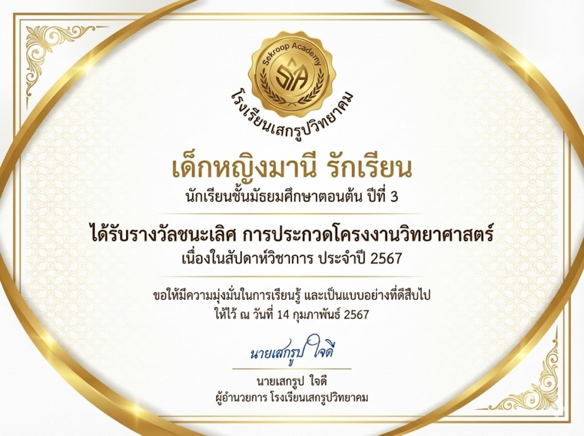 เกียรติบัตรเรียนดีกรอบทอง