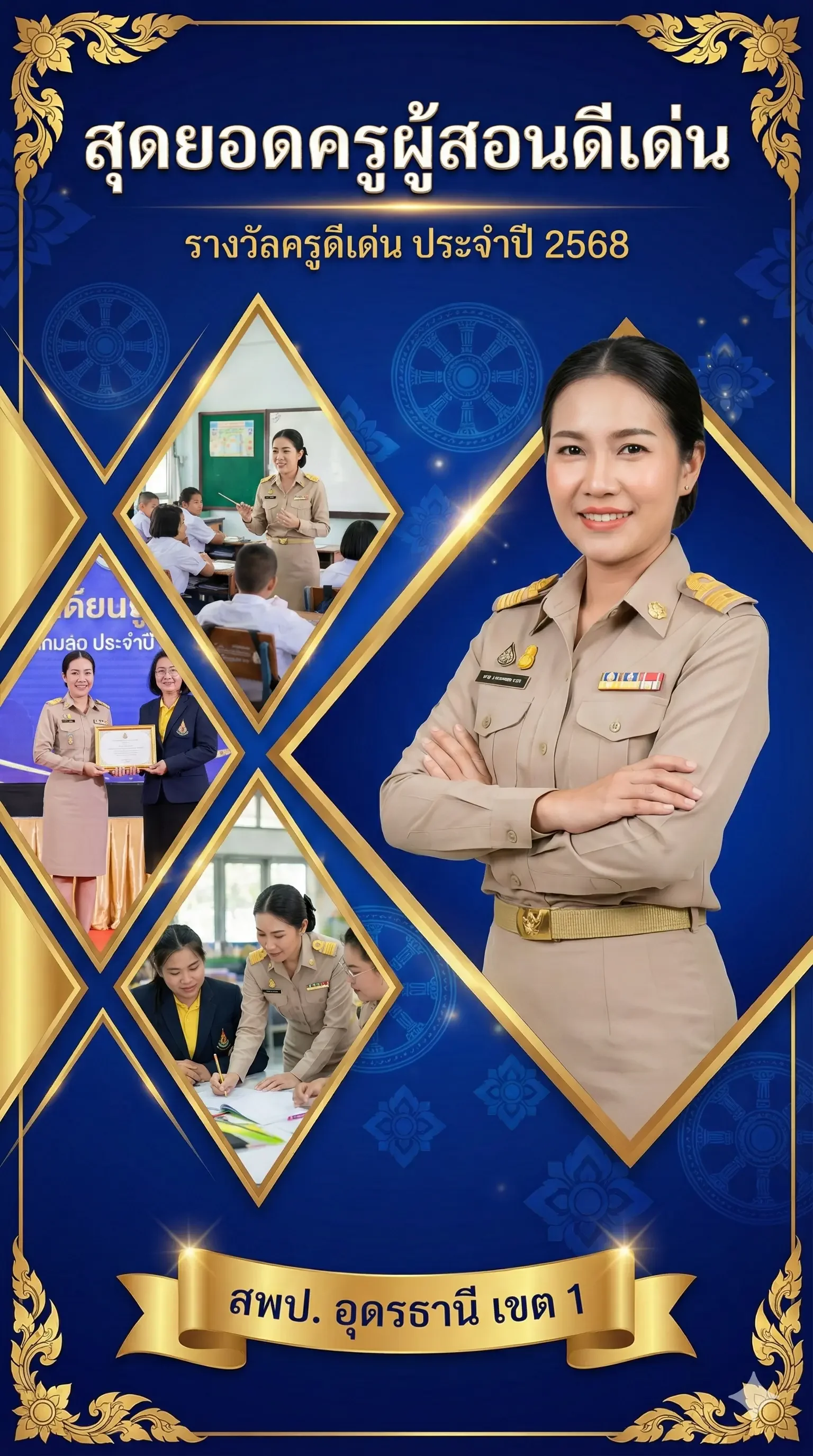 แม่แบบโปสเตอร์แนวตั้งสำหรับงานราชการ งานมอบรางวัล หรือการเชิดชูเกียรติ โดดเด่นด้วยลวดลายไทยสีทองบนพื้นน้ำเงิน ให้ความรู้สึกขลัง เป็นทางการ และสง่างาม คำแนะนำการใช้งาน: ระบุบุคคลหลัก: หากต้องการเปลี่ยนเป็นนักเรียน ให้เพิ่มเป็น "Student in Thai school uniform" หรือหากเป็นพนักงานบริษัท ให้เพิ่มเป็น "Business person in formal suit". ระบุภาพย่อย: สามารถปรับเปลี่ยนกิจกรรมในกรอบสี่เหลี่ยมข้าวหลามตัดได้ตามบริบทของงาน