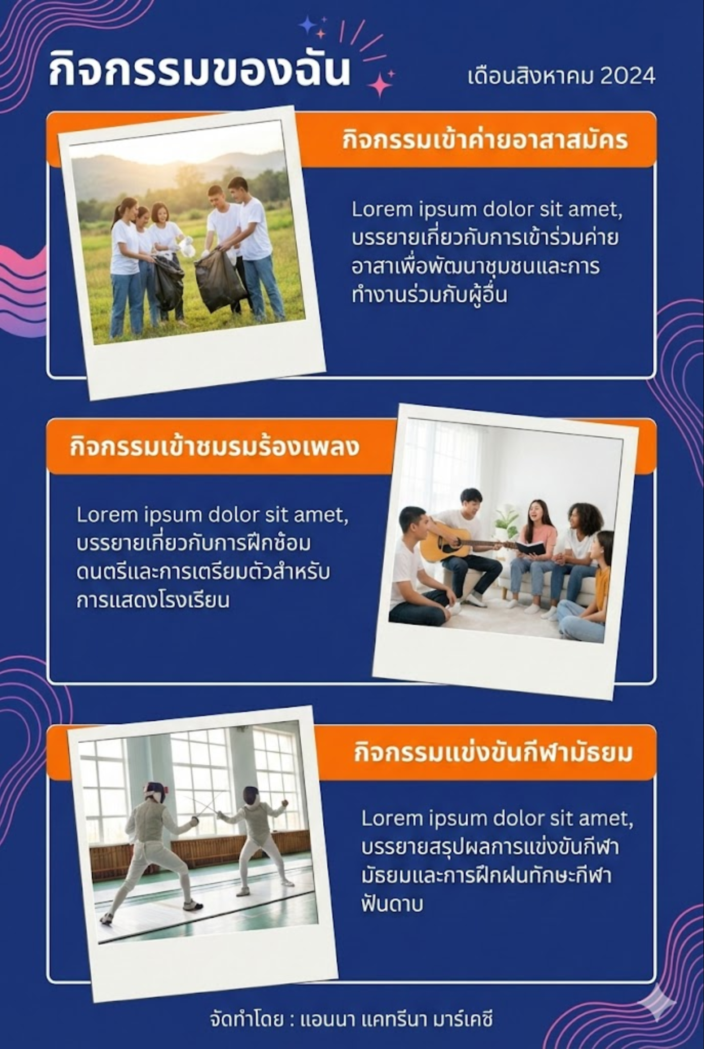 Template สำหรับสรุปกิจกรรมประจำเดือนหรือทำ Portfolio ผลงานนักเรียน/นักศึกษา จัดวางรูปภาพกิจกรรม 3 ส่วนพร้อมคำบรรยายอย่างเป็นระเบียบ