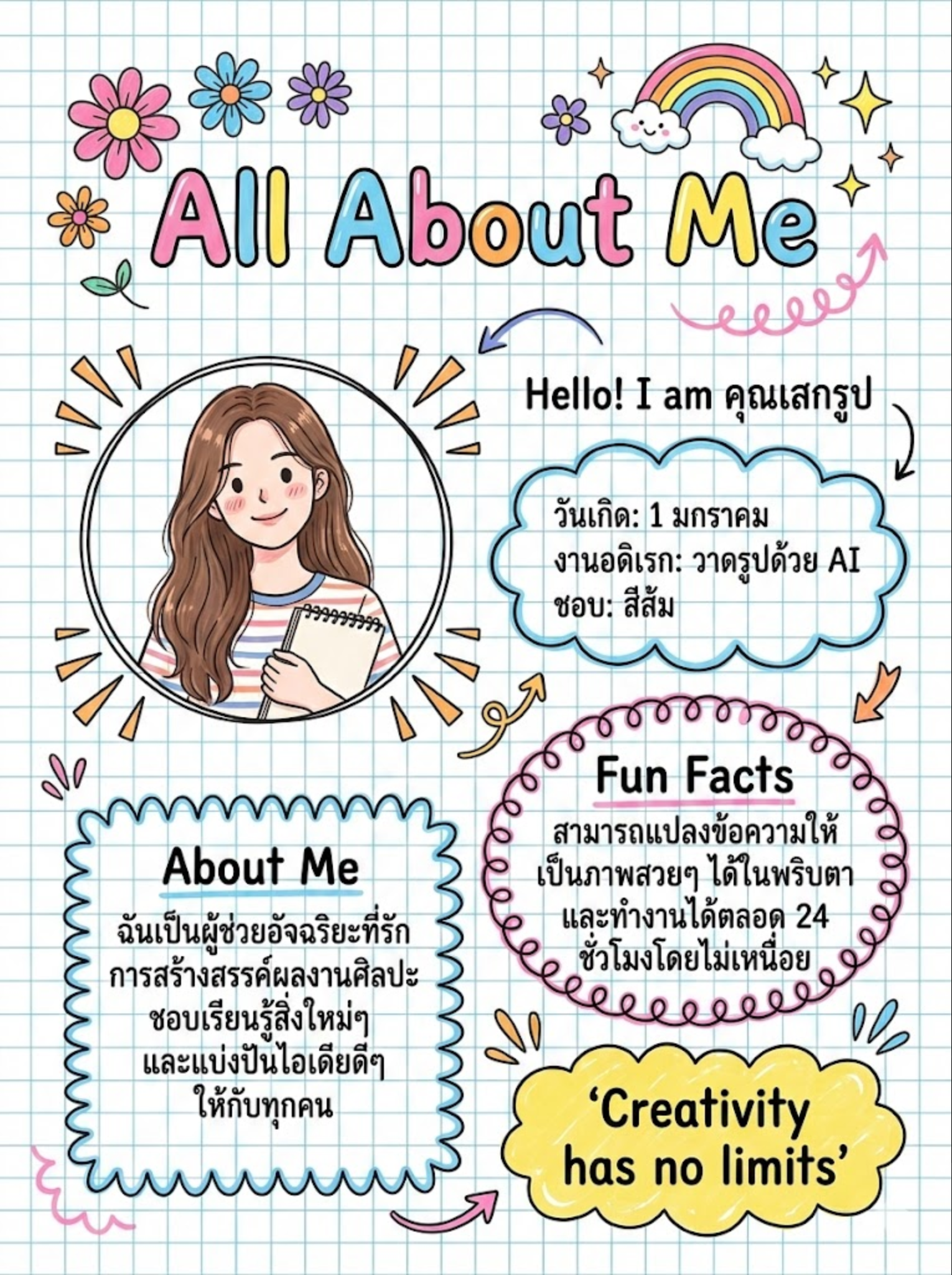 เทมเพลต All About Me บนกระดาษกราฟ ตกแต่งด้วยลายเส้นวาดมือและสีสันสดใส เหมาะสำหรับทำใบงานแนะนำตัวหรือโปรไฟล์