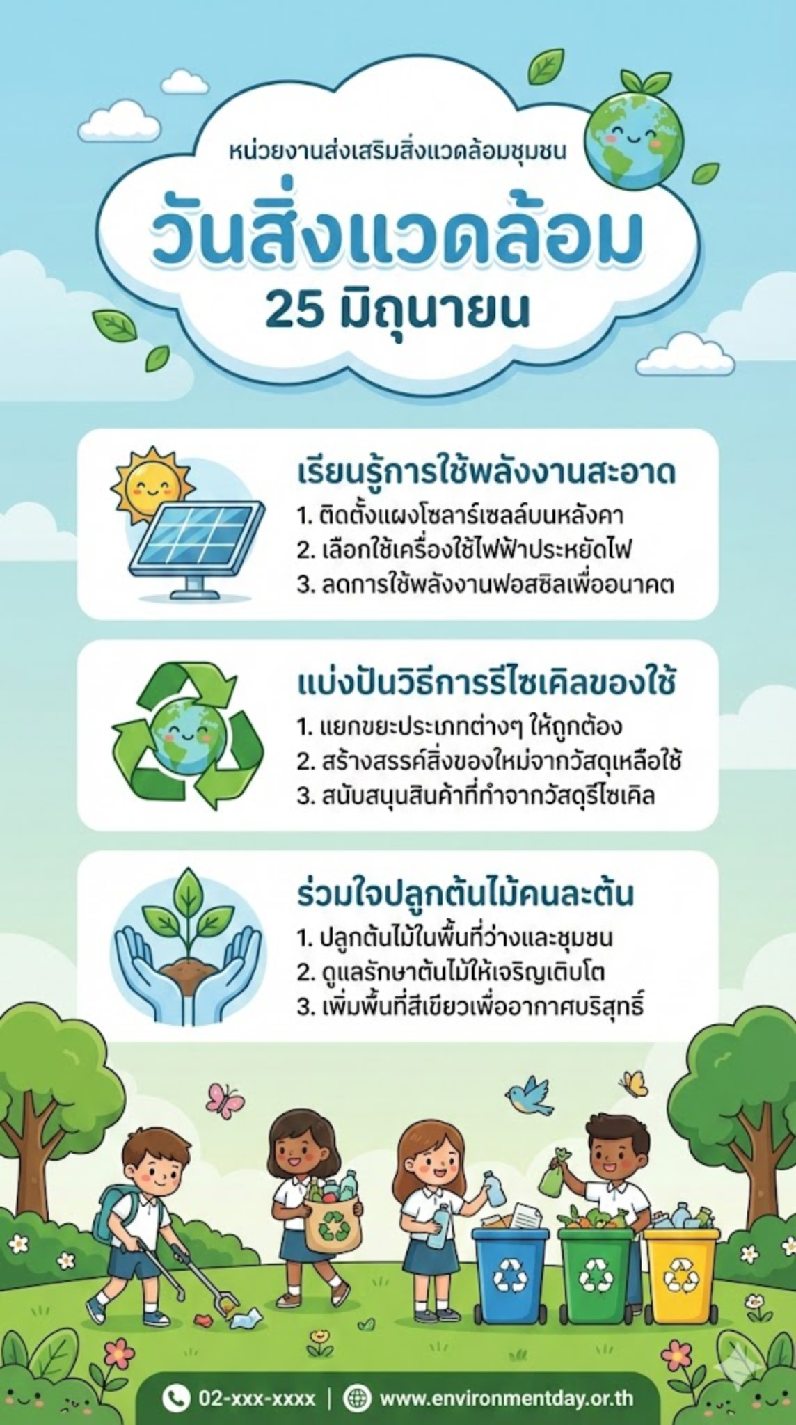 เทมเพลต Infographic ประชาสัมพันธ์กิจกรรมอนุรักษ์ธรรมชาติ รูปแบบการ์ด 3 ช่อง พร้อมภาพประกอบสไตล์ Flat Design สดใส